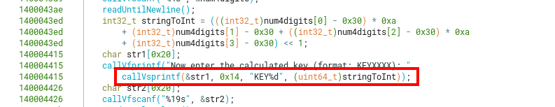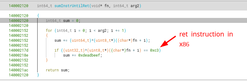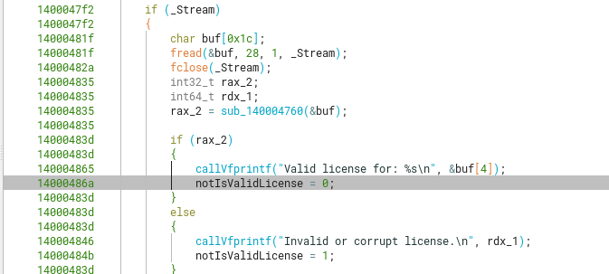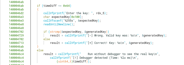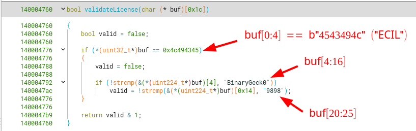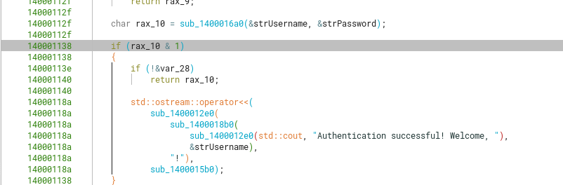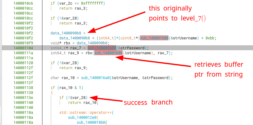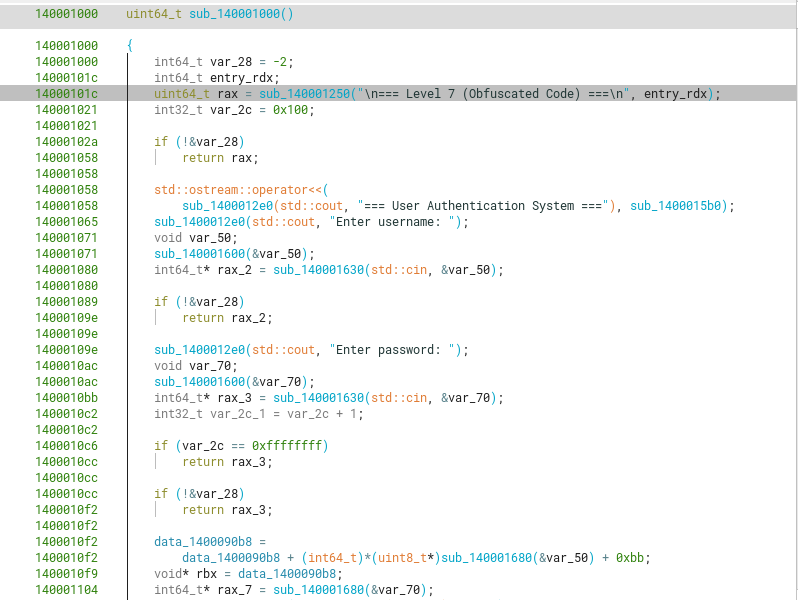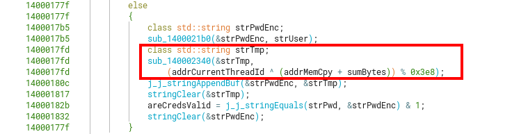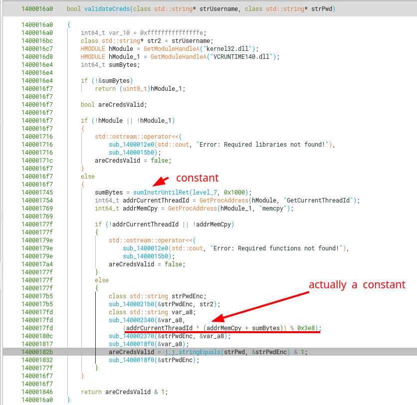 Looking at the second relevant call inside the validateCreds function (sub_140002340), which does a calculation with 2 DLL offsets and the sum of bytes for level_7, we can see that it’s a previously called function inside sub_1400021b0. That is, part of its code is also used inside sub_1400021b0.