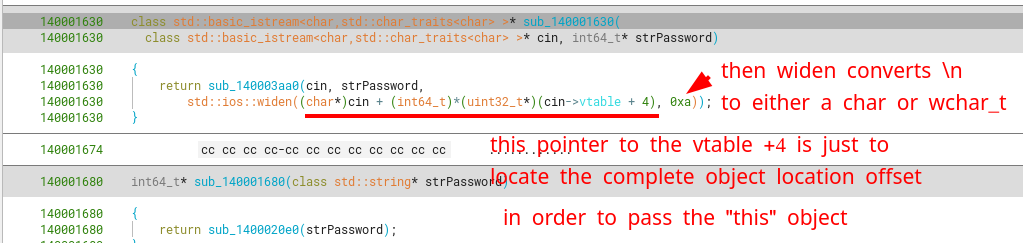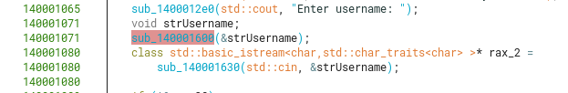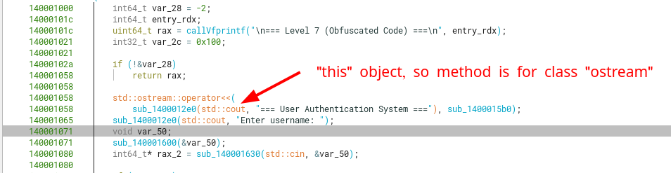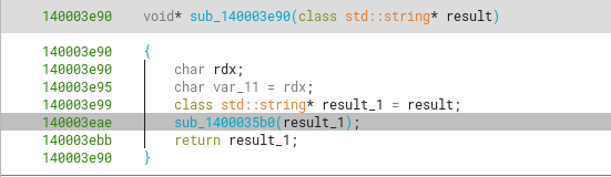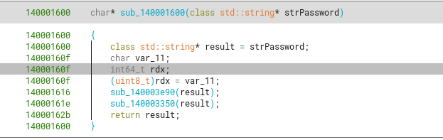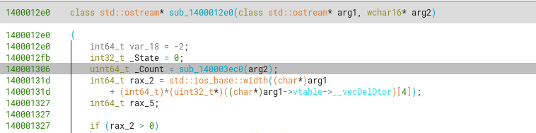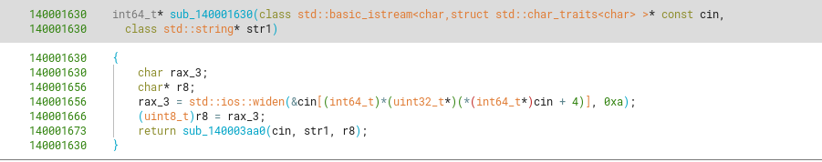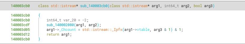 Still, by the end of this write-up I can already tell that there was little success with the function signatures I had, and had to manually identify most standard C++ functions from this binary. Although class definitions were (and always are) really useful.