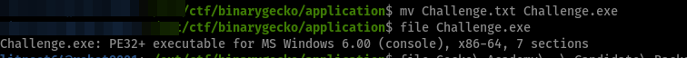 Starting with the basics for this binary, we can see from its magic bytes that it’s a PE for x86_64 without GUI (Console).