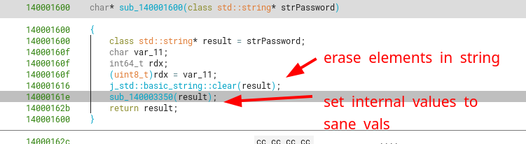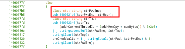 Other steps in validateCreds involve erasing or clearing the previously initialized strings, however a much more interesting part is the comparison between the original password we input, with the now encoded username + long.