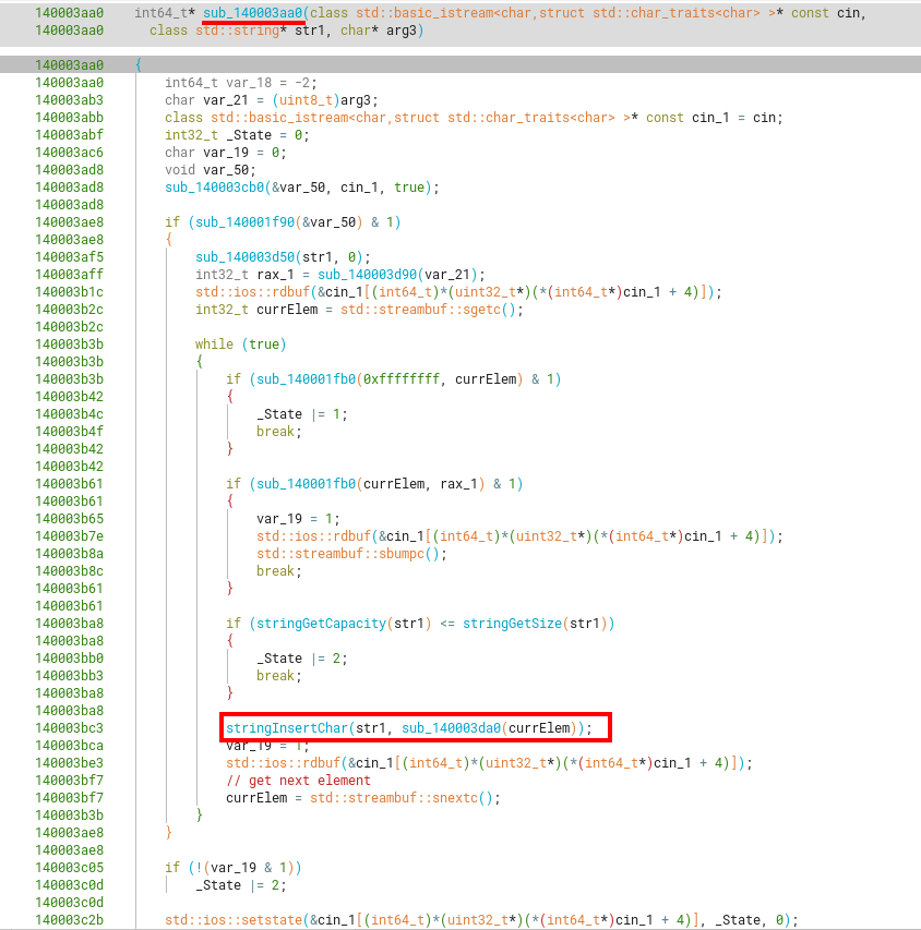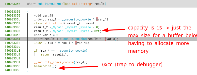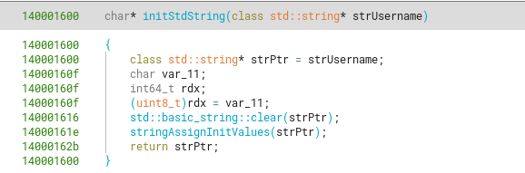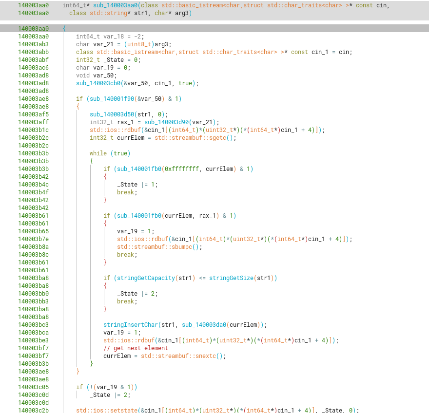 Starting the analysis for the code, I have to note that I already had created and loaded some signature files for the MVSC compiler in different versions, along with the data structures for the Microsoft STL. This helps a lot when doing RE for Windows C++, as Microsoft’s CXX classes and functions differ a little from those of Linux when compiled with MSVC.