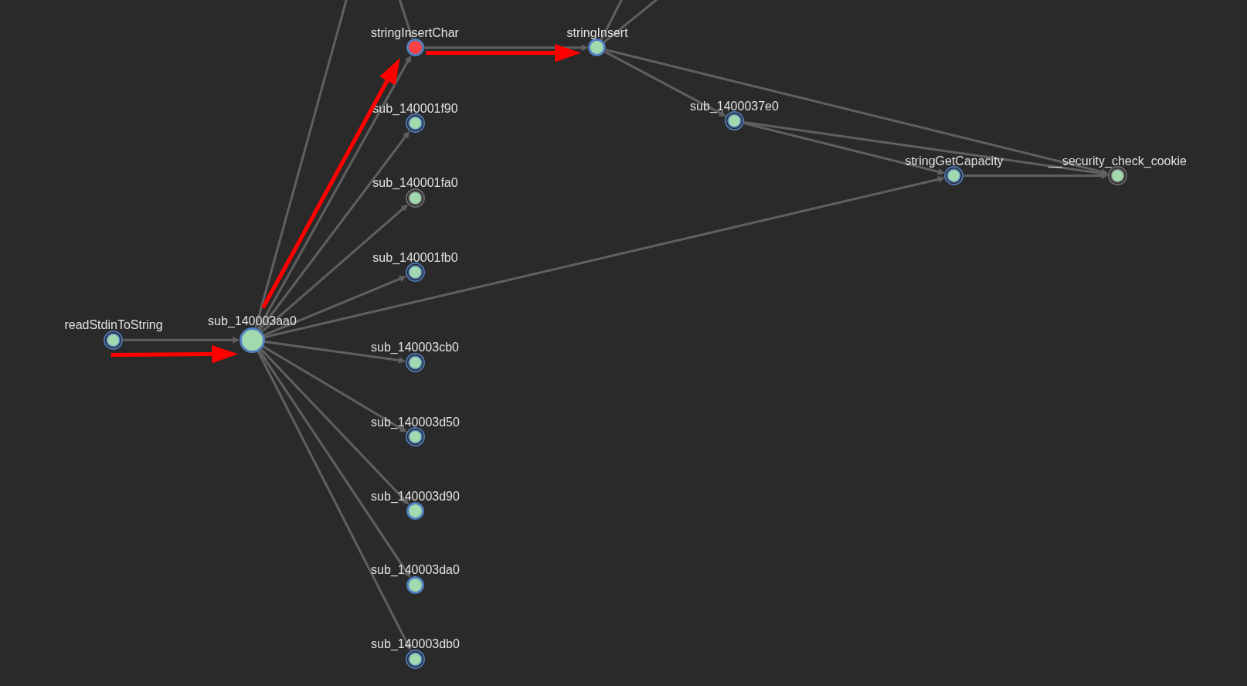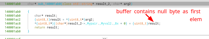 Going deeper into the callgraph, the sub_140003110 function shows us it’s appending (or assigning) the values from a string version representation of arg2 (sizeMult) into this new string (arg1).
