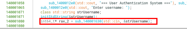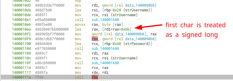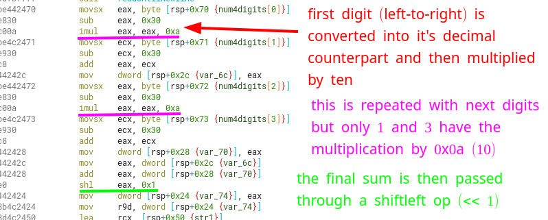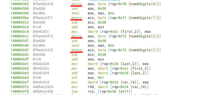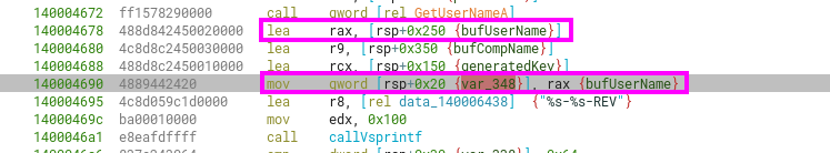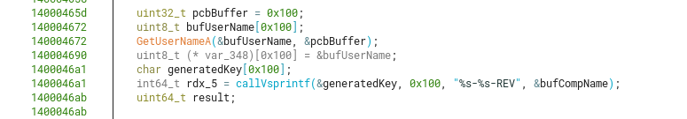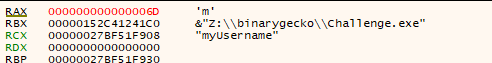 Afterward, an interesting calculation is made with the length of the username. This is shown in the decompiled view as a simple operation, however it’s more complex looking at the individual x86 instructions, although the results using both expressions are the same.