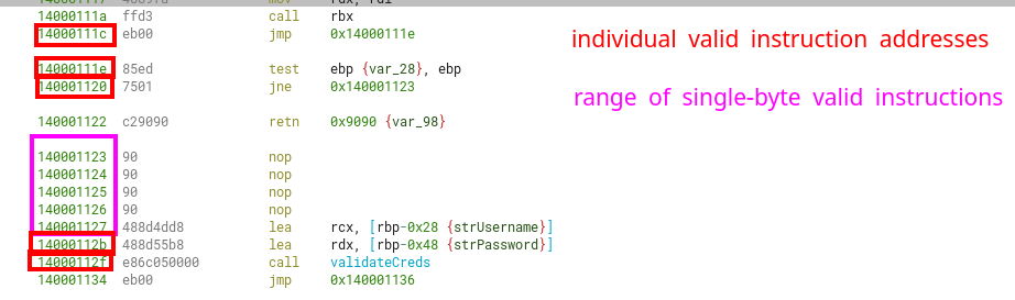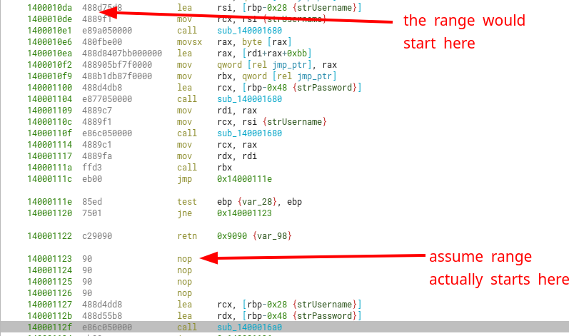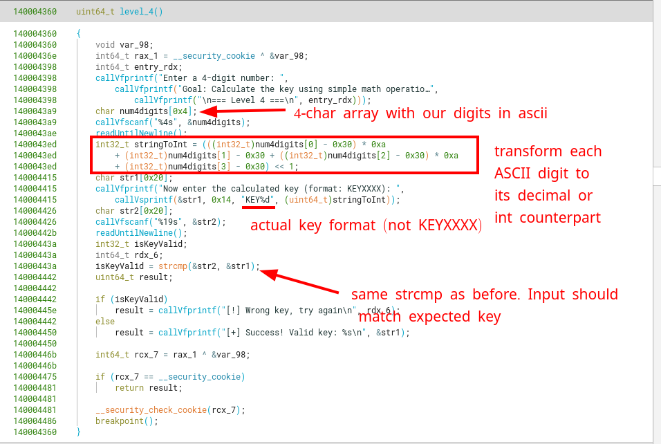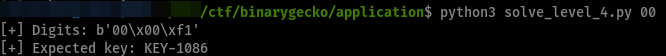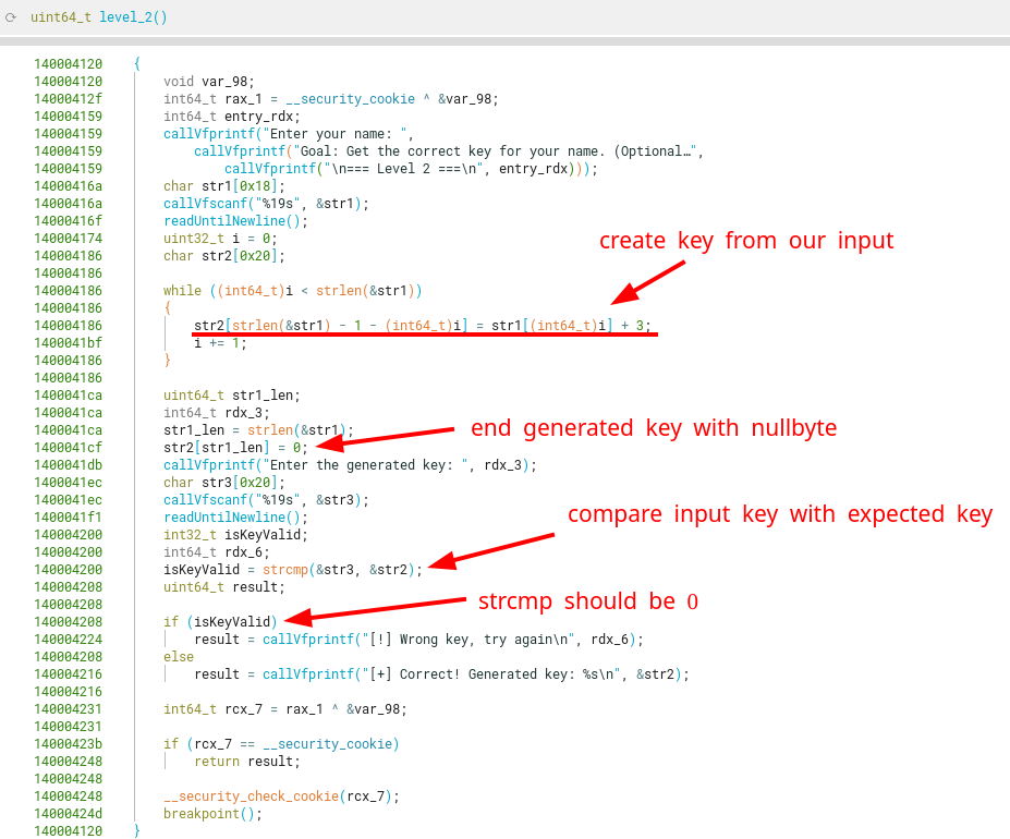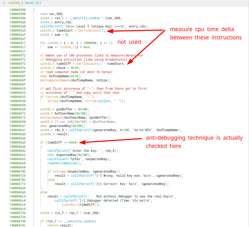 Something I missed when originally retrieving the sumBytes constant after calculation inside a debugger, is that software breakpoints were being taken into account for the sum of bytes. As I planted some breakpoints between the start of level_7 and its first 0x1000 bytes, I got an incorrect value that got dragged into the calculations for the final encoded username, as software breakpoints are created inserting the instruction int3 (byte c3) into code. This can be fixed removing breakpoints in the areas of interest (from level_7 to its first 0x1000 bytes or until finding a ret), or just using plain ol’ hardware breakpoints, which are handled through registers and the CPU instead of inserting instructions at runtime.
