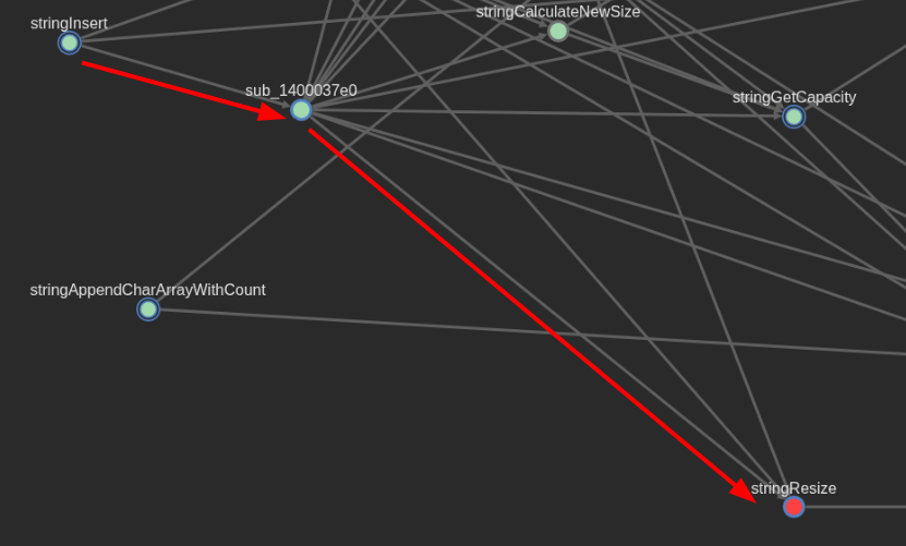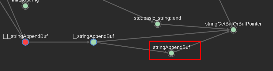 This function makes 2 calls to a function we recognized as a sort of “stringAppend” function, which resizes the internal buffer used to store the chars of the string if necessary, using new to allocate for more memory and storing the pointer instead of having an internal buffer on the string object itself.