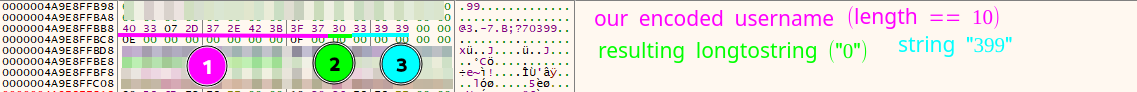 The actual value for sumBytes is 0x00000021EC7E654B. So now the constant that’s converted to a string and appended to the encoded username at the end is 0xc3 or 195 in decimal representation.