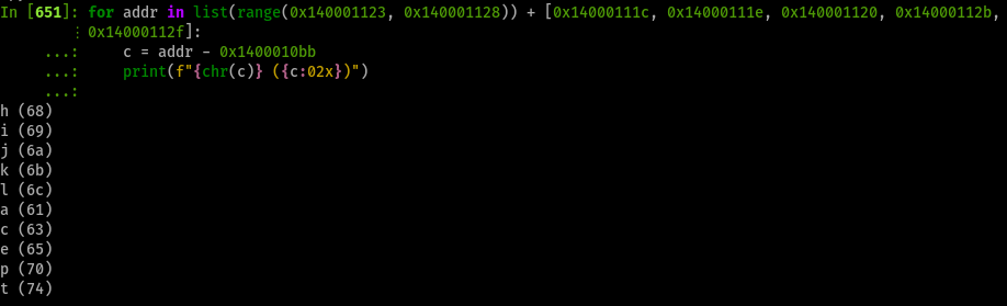 ## first char goes from "h" (0x68) to "l" (0x6c), and can also be "a" (0x61), "c" (0x63), "e" (0x65), "p" (0x70), "t" (0x74)