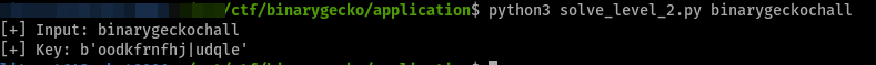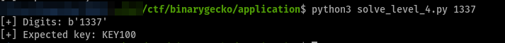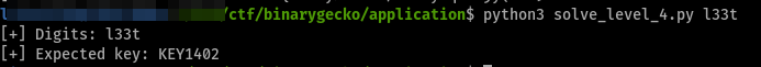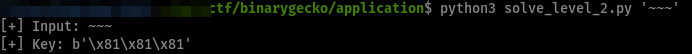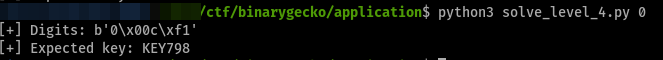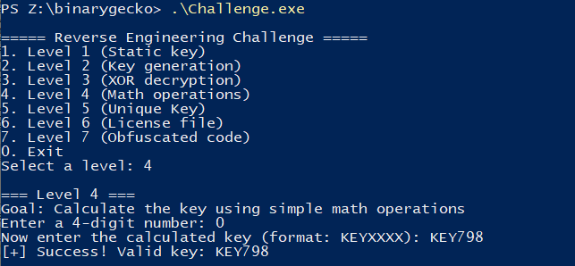 This level consists of decrypting a 4-byte hardcoded key using a XOR operation, along with a 1-byte XOR key (0x7a). The program first asks us for the expected key, which has to be at most 4-bytes long. Then it decrypts the hardcoded key with a XOR operation, and compares it with what we originally gave it. They should be the exact same input.