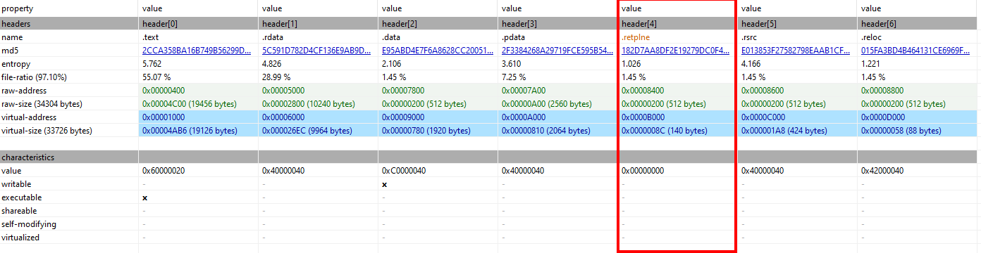 Looking at the code sections, one that initially standed out was the section .retplne, as its flags show it’s only for read, but not execute nor write.