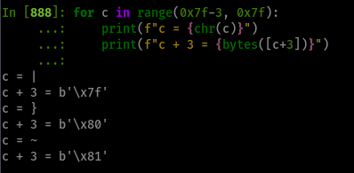 An interesting case comes up when we go near the top end of the border in the printable character range (0x20-0x7e). That is, using a string with chars like |, } and ~. As the key generation function adds 3 to each byte in the input string, these chars will make the generated key go to non-printable chars.