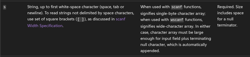 The string is read using the format string %19s in scanf, which means it will read 19 single-byte chars unless it finds a space, tab or newline (according to Microsoft’s specs).